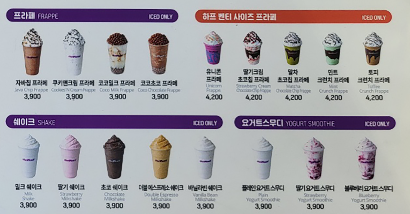 하트 벤티 사이즈 메뉴 중 단연~!! 유니콘 프라페가 아닐까 합니다. 이 메뉴의 경우 다음1분, 네이버포스트를 통해서 정말 많이 소개된 제품인 것같아요. 맛을 둘째치고 비주얼 때문에 많은 분들의 호기심은 불러일으킨 제품같아요. 하지만 프라페 메뉴 중 베스트 메뉴는? 바로 코코초코 프라페입니다. 깊고 진한 초코맛에 코코볼이 가득담긴 프라페입니다. 아참~!! 유니콘 프라페의 경우는 새콤달콤함 요거트에 팝핑캔디가 솔솔솔 뿌려있는 것이 유니콘 프라페랍니다.