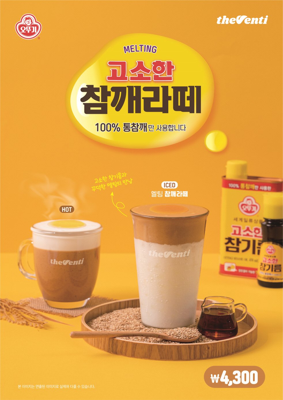 오뚜기와 콜라보를 해서 "멜팅 참깨 라떼"를 출시도 했다고해요. 통참깨 100% 참기름에 미숫가루를 넣어서 달달한 멜팅 라떼라고 해요. 그런데... ㅎㅎㅎ 참기름.... 참깨.... 전 패스~