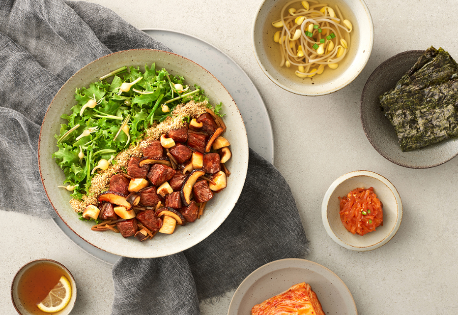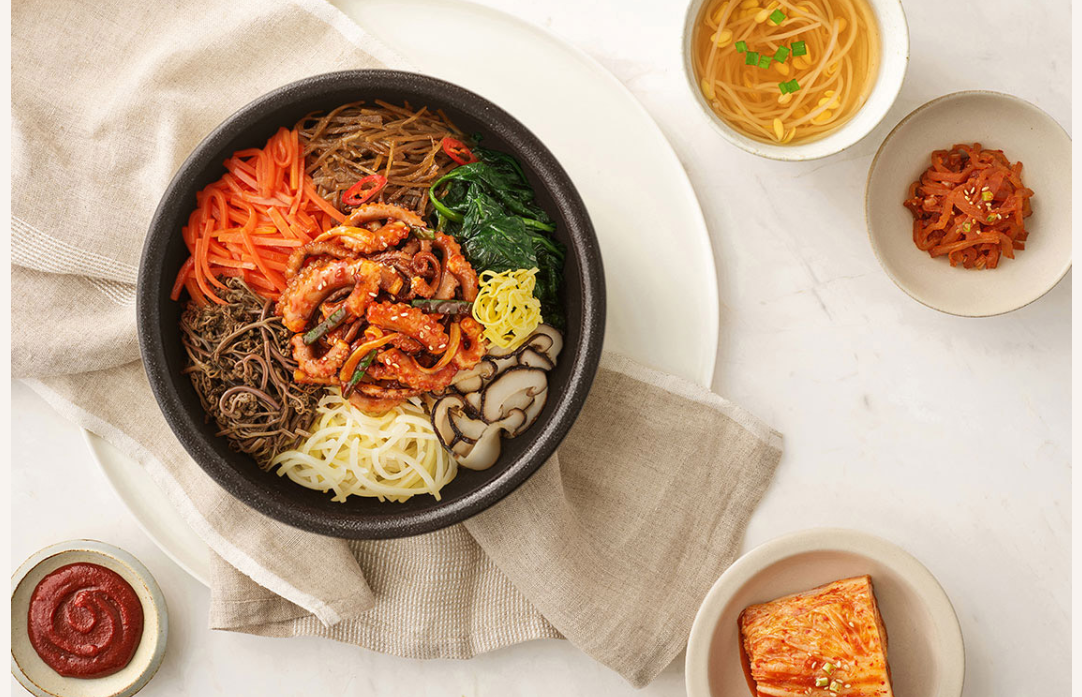 깍둑소고기비빔밥은 비빔밥 + 콩나물국 + 김치 + 장아찌 + 김 + 레몬 간장 + 참기름 이렇게 나옵니다. 참고하세요.