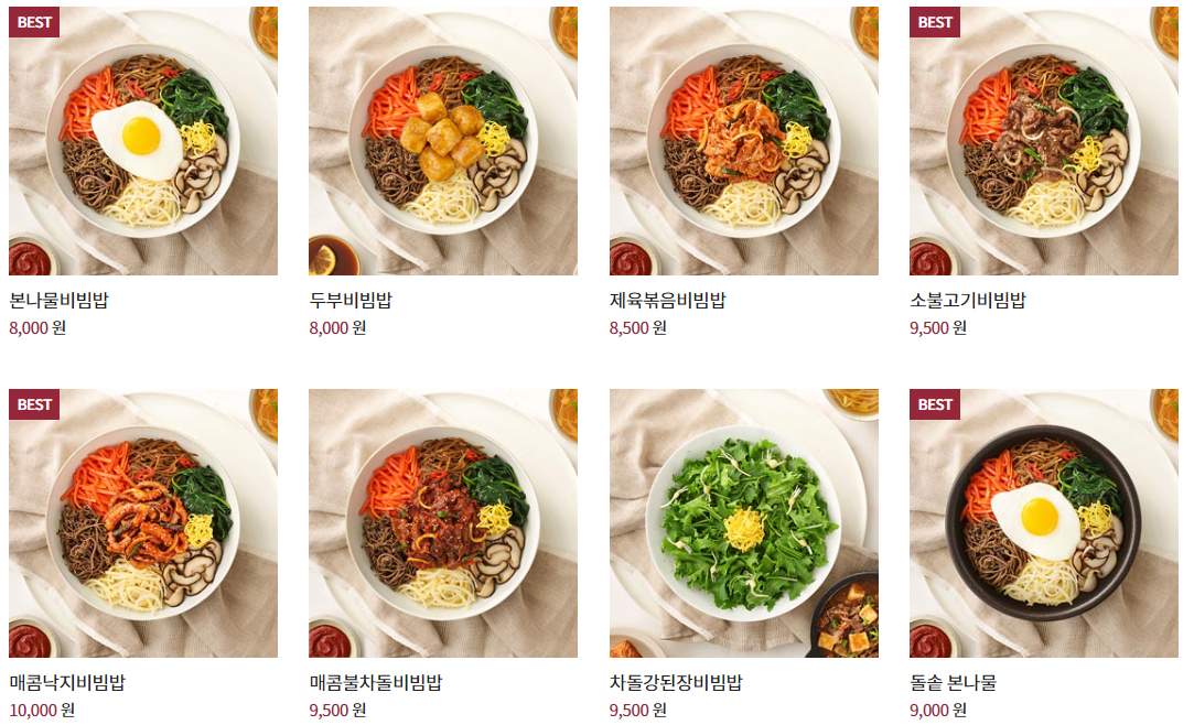 두번째 메뉴입니다. 여기에서는 본비빔밥, 본도시락 베스트 메뉴 소개해드릴게요. 바로 본나물비빔밥, 소불고기비빔밥, 매콤낙지비빔밥, 돌솥본나물 이렇게 나오네요. 본도시락 베스트 메뉴예요. 가장 무난한 메뉴라서 많은 분들이 좋아하는 것 같은 저의 생각..입니다. 비빔밥 메뉴 중 제가 가장 좋아하는 본나물비빔밥.... 작년에 진짜 자주 먹었던 메뉴인데 작년에 7000 원주고 먹었던 기억이.... 나는데, 지금 보니 8000원이네요.