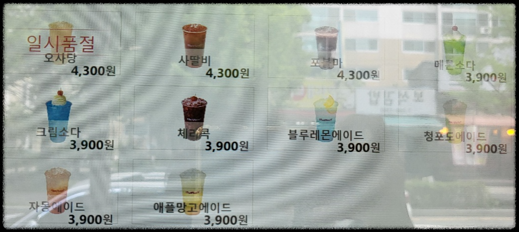 여기서 제가 설명해드릴 부분은 메뉴설명 잠시 해드릴께요. 오사당은 오렌지+사과+당근이 들어있고, 사딸비는 사과+딸기+비트, 포블마는 포도+블루베리+고구마 이렇게 포함되어 있는 메뉴에요. 크림소다 음료는 소다맛에이드에 바닐라아이스크림이 올려져있는 음료에요. 체리콕음료는 체리시럽과 콜라가 같이 들어있는 음료에요.