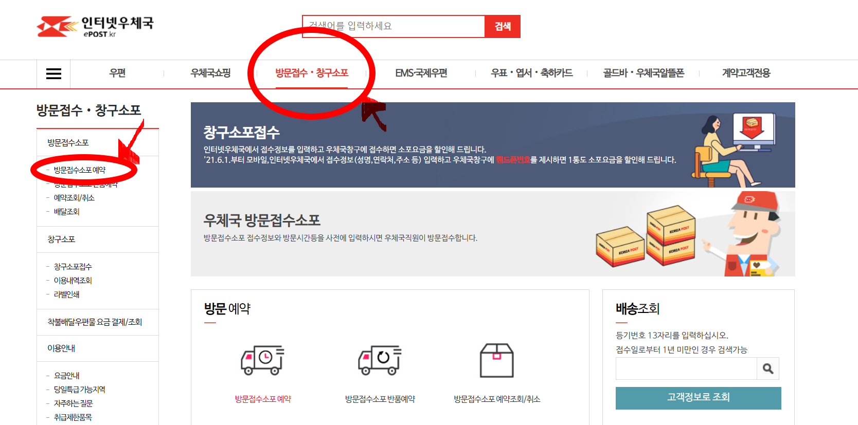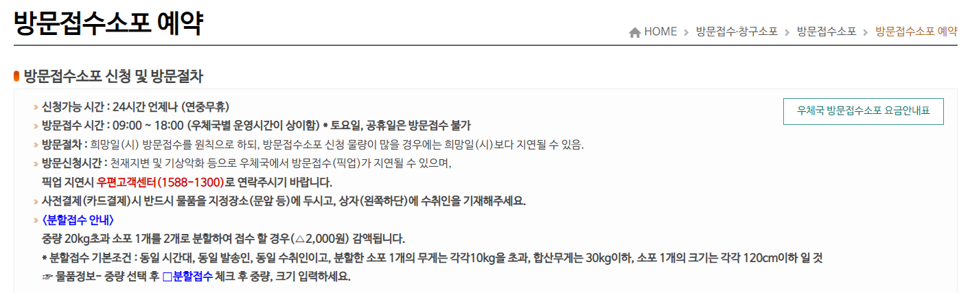 위에 사진보면 빨간색 동그라미 보이시죠? 우체국 택배 사이트 접속해서 "방문접수. 창구 소포" - 방문접수 소포 예약 눌러주세요.