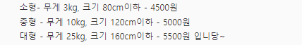 중량과 크기를 정해야 택배 가격이 결정됩니다. 중량과 크기에 따른 상세 사항은 아래 이미지 참고하세요.