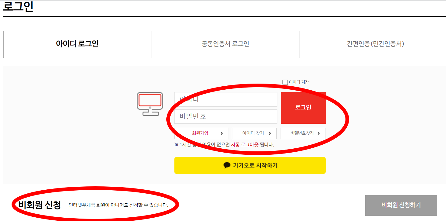 우체국 택배 사이트 접속 후 아이디랑 비번이 없다면 회원 가입해주세요. 믿을만한 우체국 택배가 오배송되거나 상품이 없어지는 일은 정말 번개 맞을 확률로 없겠지만,, 그리고 나중에 배송 조회할 때도 아이디랑 비번으로 로그인해서 찾는 게 정신건강상 더 좋아요. 만약 정말 회원가입 싫다~!! 하시는 분은 비회원으로 진행~