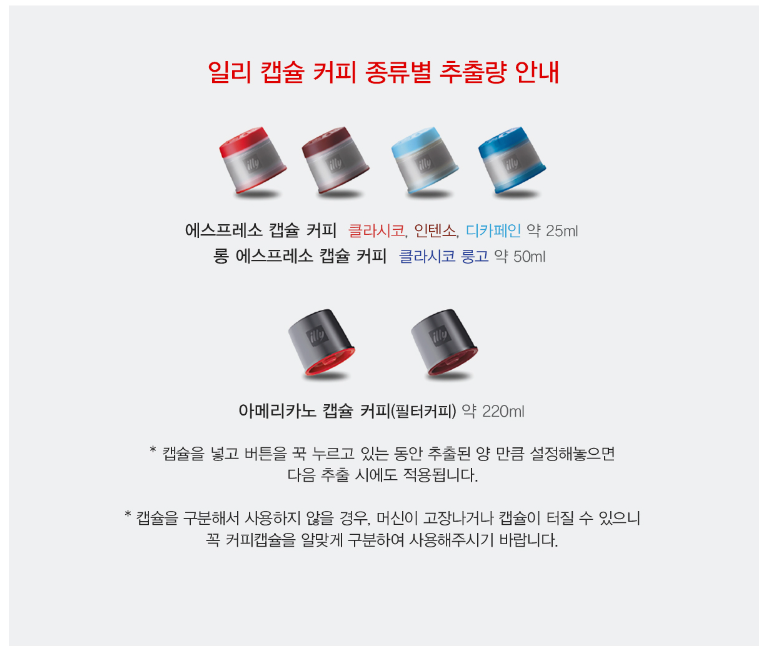 그런데 이러나 저러나 커피전문점에서 투샷으로 커피를 마시고 있으니.... 캡슐커피 한 개로는 아쉽고 두 개는 추출해야 커피전문점과 비슷한 맛이 나는 것 같아요. 커피 전문점처럼 마시겠다 하신다면 캡슐커피 구매 예산 설정할 때 하루에 두 개 캡슐 사용하는 비용으로 측정하시는 것이.... 좋을 것 같다는.. 저의 생각을 남기며... 빠 2~~ (제가 사진 캡쳐한 곳은 모두 일리 본사 사이트입니다. )