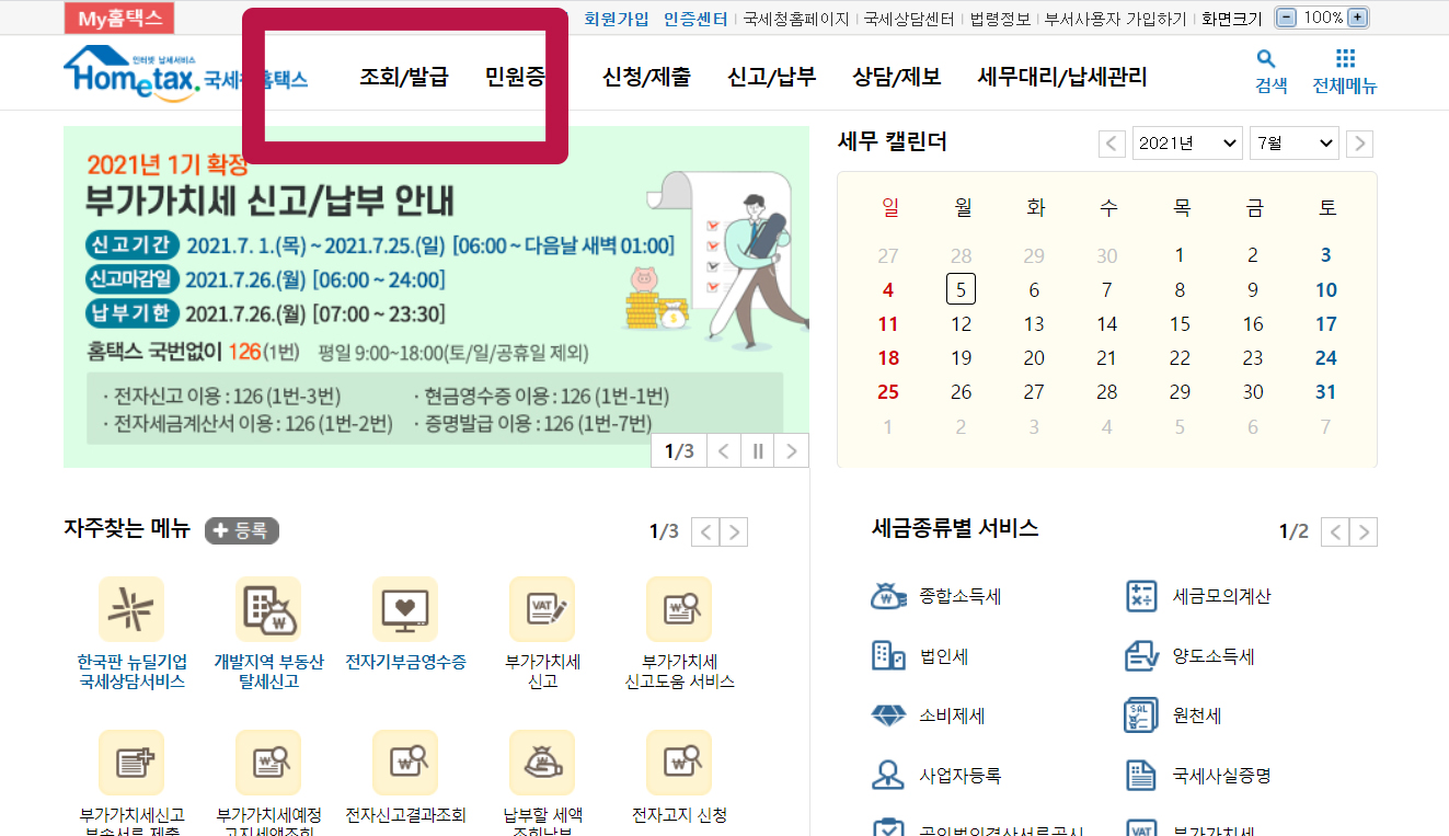 국세청 홈텍스에 들어갔다면 조회, 발급버튼을 눌러주세요.
