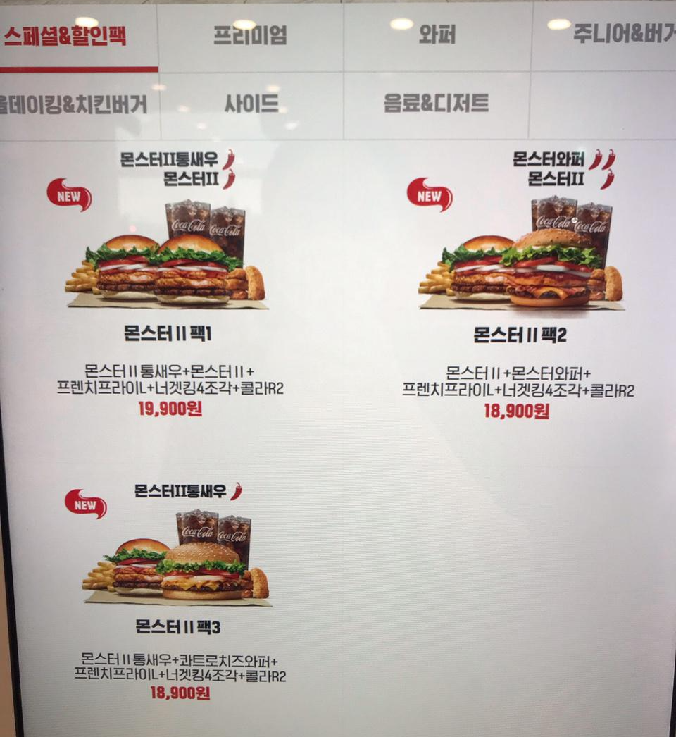 사진에 있는 모든 버거킹 버거의 가격은 모두 단품가격입니다. 정리해보자면 버거킹 메뉴에는 크게 3개가 있습니다. 라지 세트, 기본 세트, 단품 이렇게 구분이 되어있습니다.